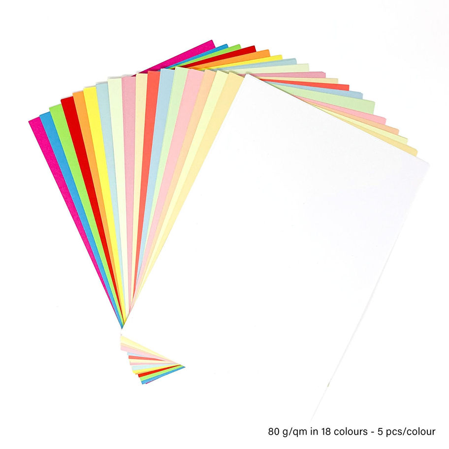 25 different colours selected in 4 types of thickness. You don't need to buy separate paper sets for cardboard papers and thin papers.
